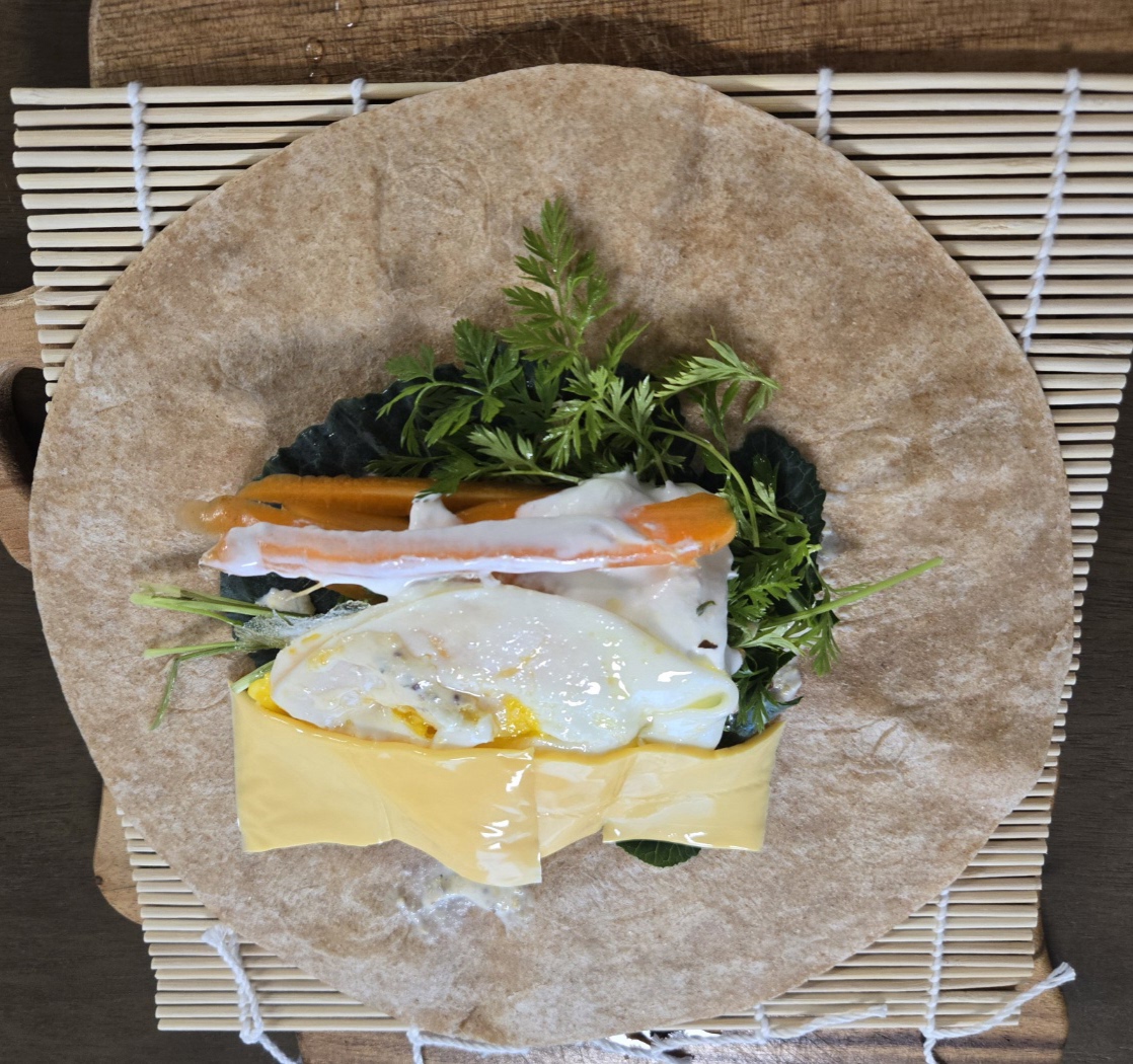 케일, 잎 당근, 고수, 계란프라이, 치즈 넣고 또띠아 에 싸서 먹으니 야채를 먹기 편해요.